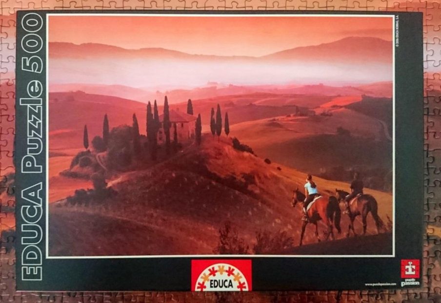 Después de un puzzle de 3000 piezas… un Educa de 500 piezas. Es un atardecer en Toscana, Italia, la cual se encuentra en la región central de Italia y es muy famosa por sus paisajes, tradiciones, historia y su legado artístico. Es reconocida como la cuna del Renacimiento Italiano, y es el hogar de museos de renombre como el Palacio Uffizi y el Palacio Pitti. Esta región es un destino muy popular en Italia, teniendo como principales destinos turísticos Florencia (su capital), Pisa, Montecatini Terme, Castiglione della Pescaia, Grosseto, Siena, Luca y Versilia.