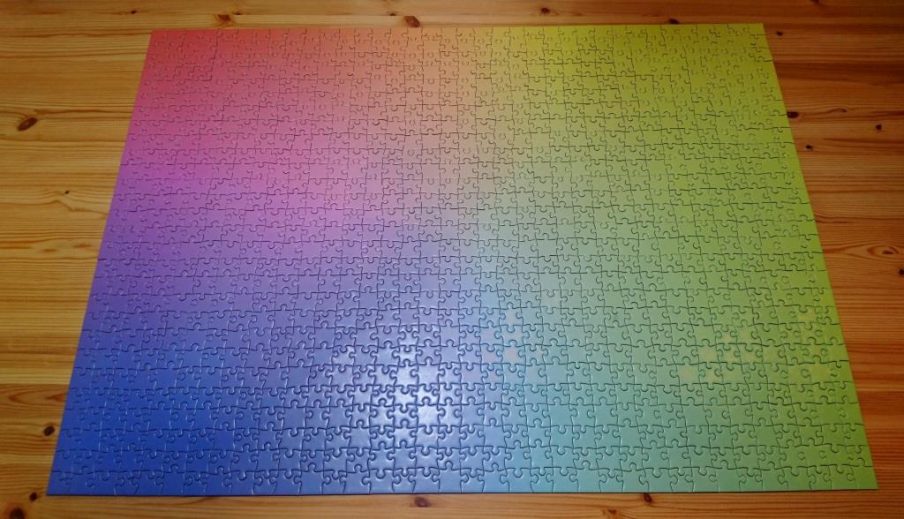 Para empezar fue dando vuelta a todas las piezas e intente separarlas por colores. Coloque el borde y ya después empecé a montar el resto puzzle. Primero por el azul, que es mi color favorito y hacia los tonos morados y luego rosados y con esto ya va medio puzzle hecho. Después seguí con el azul claro que poco a poco se fue tornando verde y por ultimo en amarillo. En tres horas y dieciséis minutos estuvo terminado. El montaje de este puzzle fue mucho mas fácil de lo que esperaba, creo que la clave era empezar por un color e ir siguiendo los cambios de tono. Una manera diferente de montar un puzzle del habitual y también de disfrutarlo. Tengo que decir que este ha sido mi puzzle favorito del 2017!