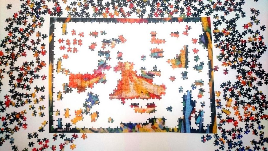 Viendo la imagen de este puzzle, los contrastes de colores y que no hay zonas definidas; se puede adivinar que es un puzzle difícil. Me atrevería a decir que ha sido el puzzle más difícil que hemos hecho este año. Para empezar, hemos dado la vuelta a todas las piezas y buscado los bordes. Después de terminar los bordes, he visto que en la esquina derecha hay una zona azul que se identifica fácilmente y ha sido lo primero que hemos montado. A continuación, las piezas más claras que formaban la zona entre la nariz y el ojo derecho. Y a partir de ahí, buscando los colores mas vivos se iban formando parejas o tríos de piezas. En poco tiempo terminamos los ojos y la nariz, después la boca. A partir de ahí, se hizo aún más difícil terminar el cabello y los demás espacios vacíos. Con paciencia y buena iluminación al final logramos terminarlo.